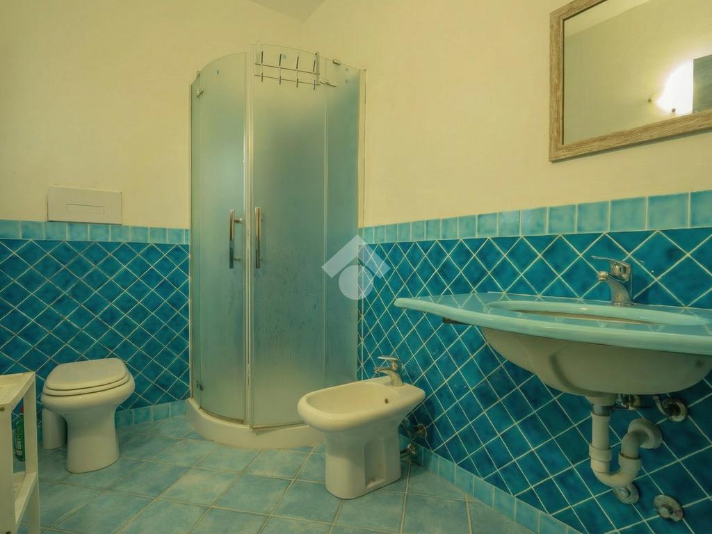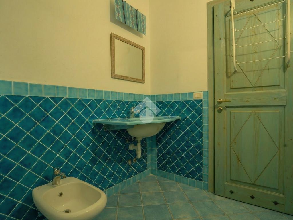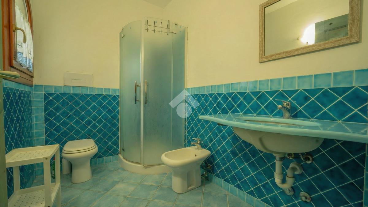 Il bagno è placato con mattonelle in Cera Sarda colo Azzurro Mare, che ne donano un'atmosfera serena e pulita. La doccia angolare dona funzionalità all'ambiente; la finestra consente l'areazione naturale.