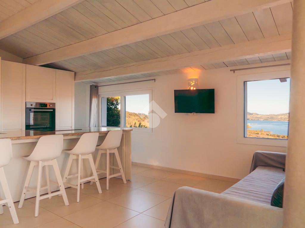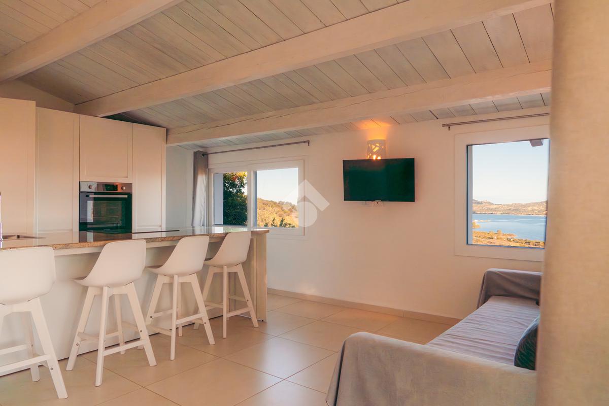 Dalla scala esterna si accede al piano primo, il terrazzo presente svetta sul mare dalla privilegiata posizione collinare, 25 metri quadri di spazio esterno coperto da pergola dove rilassarsi e stare in compagnia. Dal terrazzo a livello si accede all'interno, anche qui la sala presenta la cucina ad isola con parete attrezzata. Dal disimpegno si accede alle due camere da letto e bagno con doppio lavabo. A completare tutti i servizi è presente il fotovoltaico in grado di ottimizzare i consumi energetici della casa.