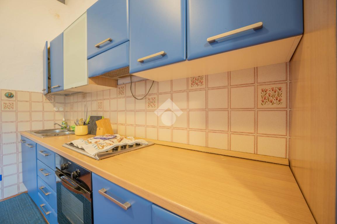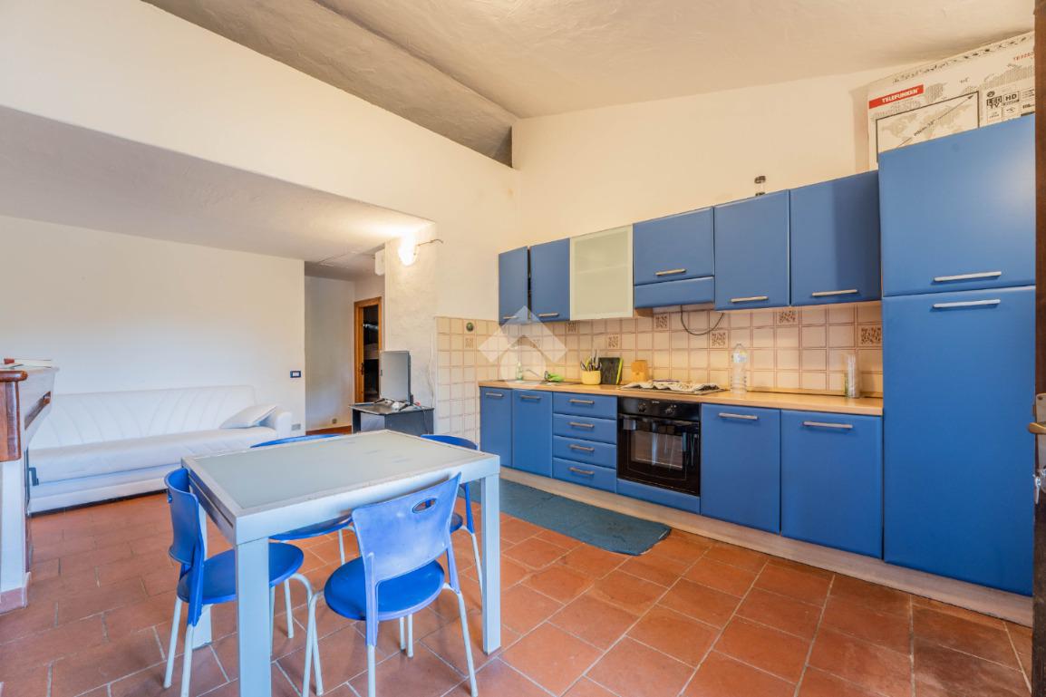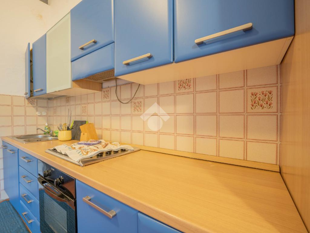 Dall'esterno si accede alla zona giorno, dotata di camino e angolo cottura lungo tutta la parete. L'ambiente è luminoso, grazie alla presenza della vetrata in legno che prospetta sul terrazzo. Da qui è possibile l'accesso alla zona soppalcata attraverso una scala retrattile, spazio ideale per accessori e ingombri.