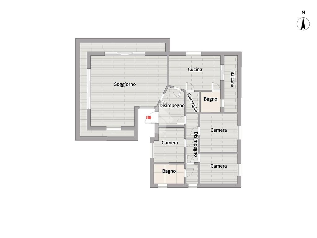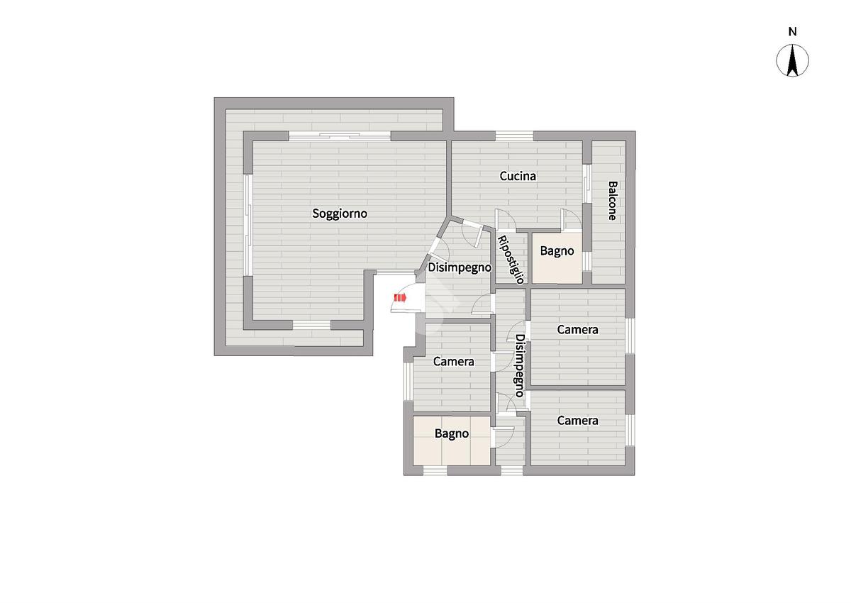 L’ala della zona notte è composta da un corridoio centrale, due camere matrimoniali sulla sinistra, una doppia sulla destra ed un bagno con antibagno, sempre finestrato con doccia.